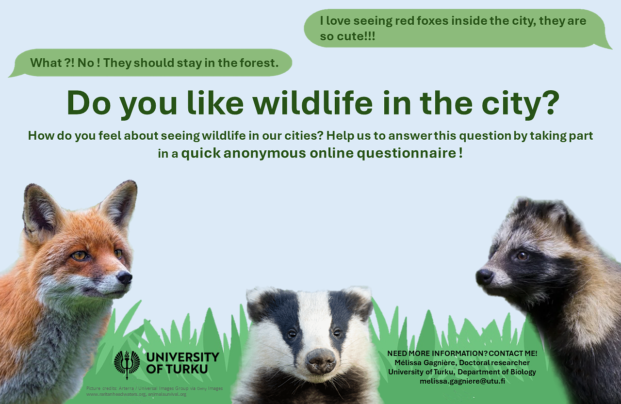 Many wild species visit urban areas daily, including carnivores. From a rewilding perspective, carnivore presence is positive. However, this is often not the case from the citizens’ perspective. Encounters with predators may cause problems, increasing safety concerns. This could reduce citizen’s well-being, leading to harmful management practices towards carnivores. Nonetheless, recent studies found that the presence of carnivores is not always considered negatively. These findings indicate a potential connection between carnivore presence and the human experience of nature. Therefore, studying how carnivores in urban areas are perceived by citizens and what kind of impact their presence could have on human well-being would contribute to understand how wildlife influences human connection to nature. Citizens usually have strong opinions about carnivores as the recent reactions towards Finland’s government’s decision to shoot a fixed number of wolves for population control have shown. Therefore, our findings will provide help for evidence-based wildlife management in urban and semi-urban environments, taking into account citizens’ needs based on their attitudes.