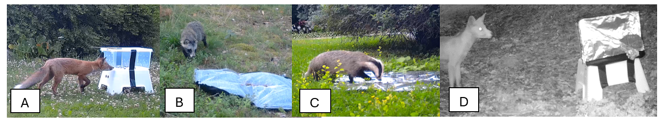Behavioural experiments are conducted on free-living carnivores in private gardens and in forested areas, monitored by wildlife camera traps. We defined our urban-rural gradient with the “Refined degree of urbanization in Europe”. A first round of data collection has been conducted along an urban-rural gradient in different cities in South-West Finland (e.g. Turku, Kaarina, Uusikaupunki, Loimaa) between June-September 2024. In summer 2025, experiments were conducted in Turku, Helsinki, Tampere, Masku, Salo and Naantali. We will continue the experiments every summer until 2027 (included) to produce enough replicates for appropriate data analysis. The experiments consist of assessing animals’ behaviours towards two novel objects (a closed box and a box partly covered with aluminium foil) and two novel surfaces (aluminium foil and bubble wrap) (Fig. 1). Objects and surfaces are food-baited to lure and motivate free-living animals to approach our experimental sites and the novel objects/surfaces. Those novel objects and novels surfaces are designed to be unusual from the animal’s point of view, even in an anthropogenic environment. The novel objects and novel surfaces demand from the animal to physically interact with them if they want to obtain the food reward. Each object/surface are available to animals’ interactions for two weeks.